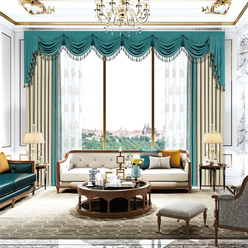 暮云春樹,成品垂直定型簾,垂美優雅,黃金等寬褶皺。高精密暗紋提花呢面料,凹凸有致,立體感強,花型若隱若現,克重1030克。絨感適中,柔軟舒適,100%遮光,且具有防水防污防霉功能。墨綠色暗紋提花呢搭配米色暗紋提花呢,時尚簡約舒適。